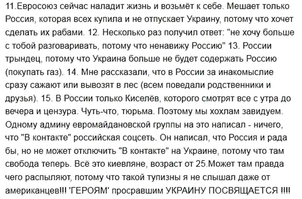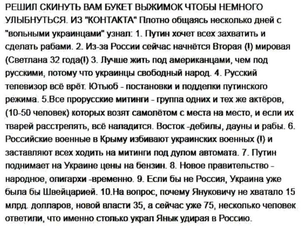 Тем временем в Киеве Раду легальных экстремистов осаждают нелегальные экстремисты, которые требуют действовать экстремистнее и обвиняют официальных экстремистов в том, что они все куплены Путиным. В ответ следуют такие же обвинения - что Путин подослал под Раду лжемайдановцев, которые пытаются дестабилизировать ситуацию в самый ответственный момент. Пока экстремисты Киева спорят, кто из них более купленный Путиным, на избитого мирными протестувальниками кандидата в гетьманы несуществующей Украины заводят уголовное дело - видимо, за то, что остался жив. Другого кандидата не пустили в телестудию под угрозой избиения так называемые автомайдановцы - понятное дело, куплены Путиным вместе с покрышками. По телеканалам народ одновременно убеждают в двух вещах: что Украина едина и все вокруг братья и что часть этого народа являются террористами и сепаратистами. Самое забавное, что многие телезрители верят и тому и другому.