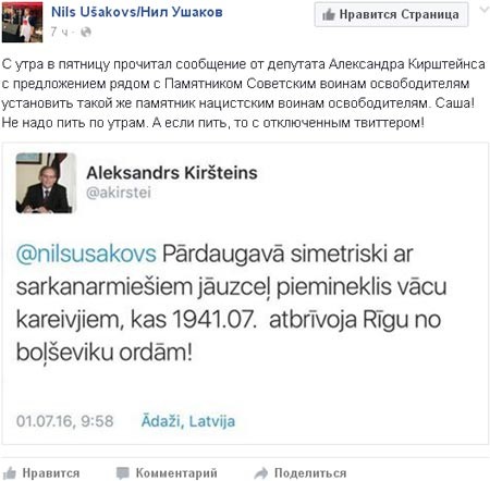 «С утра в пятницу прочитал сообщение от депутата Александра Кирштейнса с предложением рядом с Памятником Советским воинам освободителям установить такой же памятник нацистским воинам освободителям. Саша! Не надо пить по утрам. А если пить, то с отключенным твиттером!» - написал Нил Ушаков.