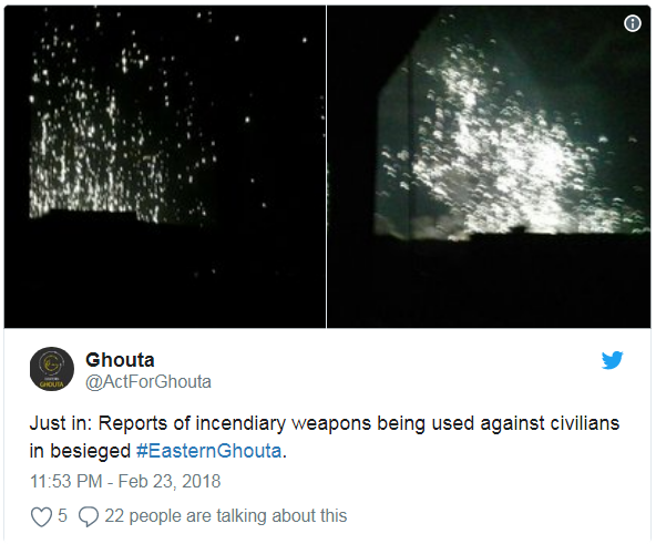 BREAKING VIDEO: These aren’t fireworks. These are incendiary weapons that are being dropped on #Ghouta by Syrian and Russian forces and are meant to cause maximum damage and loss of life. pic.twitter.com/PfDcerZZR2