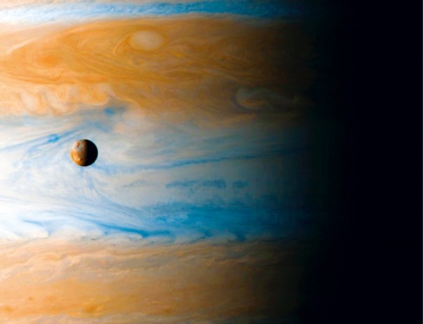 Ио, зависшая над туманной громадой Юпитера. Одна из четырех (сегодня известно гораздо больше) лун этой планеты, открытых Галилеем. Несмотря на то, что Ио такого же размера, как наша Луна, на фоне этой самой большой планеты Солнечной системы она кажется крохотной