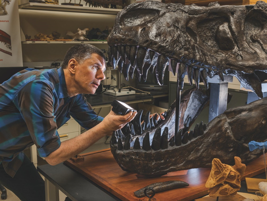 Лоуренс Уитмер рассматривает слепок черепа тираннозавра в своей лаборатории в Университете Огайо. Форма черепной коробки говорит о том, что у тираннозавра было очень хорошее обоняние. Исследование, проведенное в 2019 году, показало, что генов, отвечающих за обонятельные рецепторы, у него было в полтора раза больше, чем у человека, – к такому заключению ученые пришли, сопоставив сравнительные размеры участка мозга, обрабатывающего запахи.