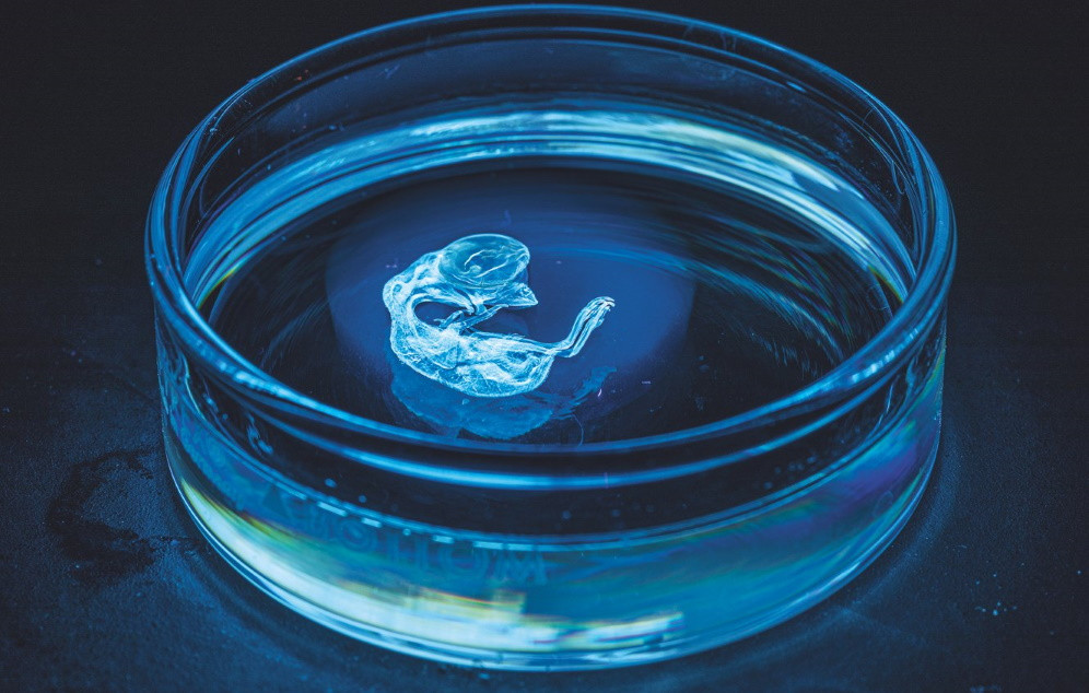 Окрашенный эмбрион цыпленка, светящийся призрачно-голубым, ждет своей очереди быть исследованным под микроскопом в лаборатории Баллара. Разобравшись, как гены контролируют рост организмов, можно понять механизмы развития животных и больше узнать о динозаврах и их современных потомках.