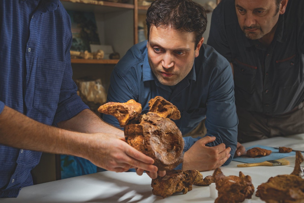 Низар Ибрагим (в центре) и его коллеги, палеонтологи Симоне Магануко (слева) и Кристиано Даль Сассо, разглядывают недавно найденные кости спинозавра, сидя в тесной лаборатории в марокканском Университете имени Хасана II. «Для меня изучение окаменелостей сродни акту творения, – говорит Даль Сассо. – Ты воскрешаешь животное, собирая его по кусочкам».