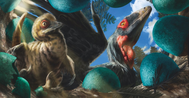 Едва вылупившийся детеныш дейнониха идит в гнзде в окружении яиц голубого цвета. За ним присматривает заботливый отец
