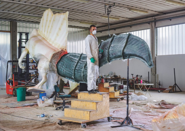 Сегодня, когда открытия, связанные с динозаврами, совершаются постоянно, растет спрос на обновленные модели. В городке Фоссальта-ди-Пьяве (Италия) Гузун Ион из компании DI.MA. Dino Makers, изготавливающей муляжи для музеев, формирует обновленный хвост для статуи молодого спинозавра в натуральную величину – 10,5 метра в длину.