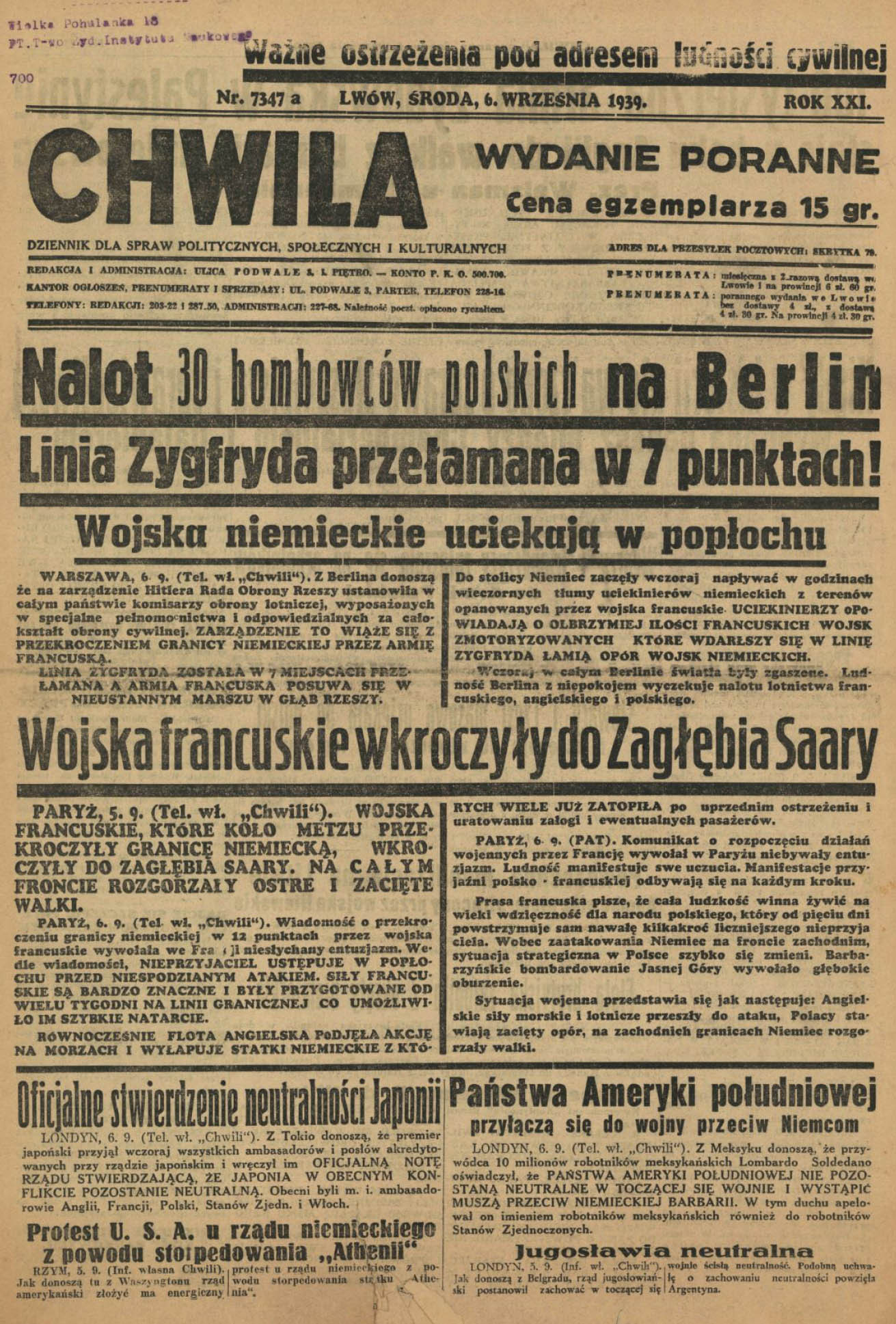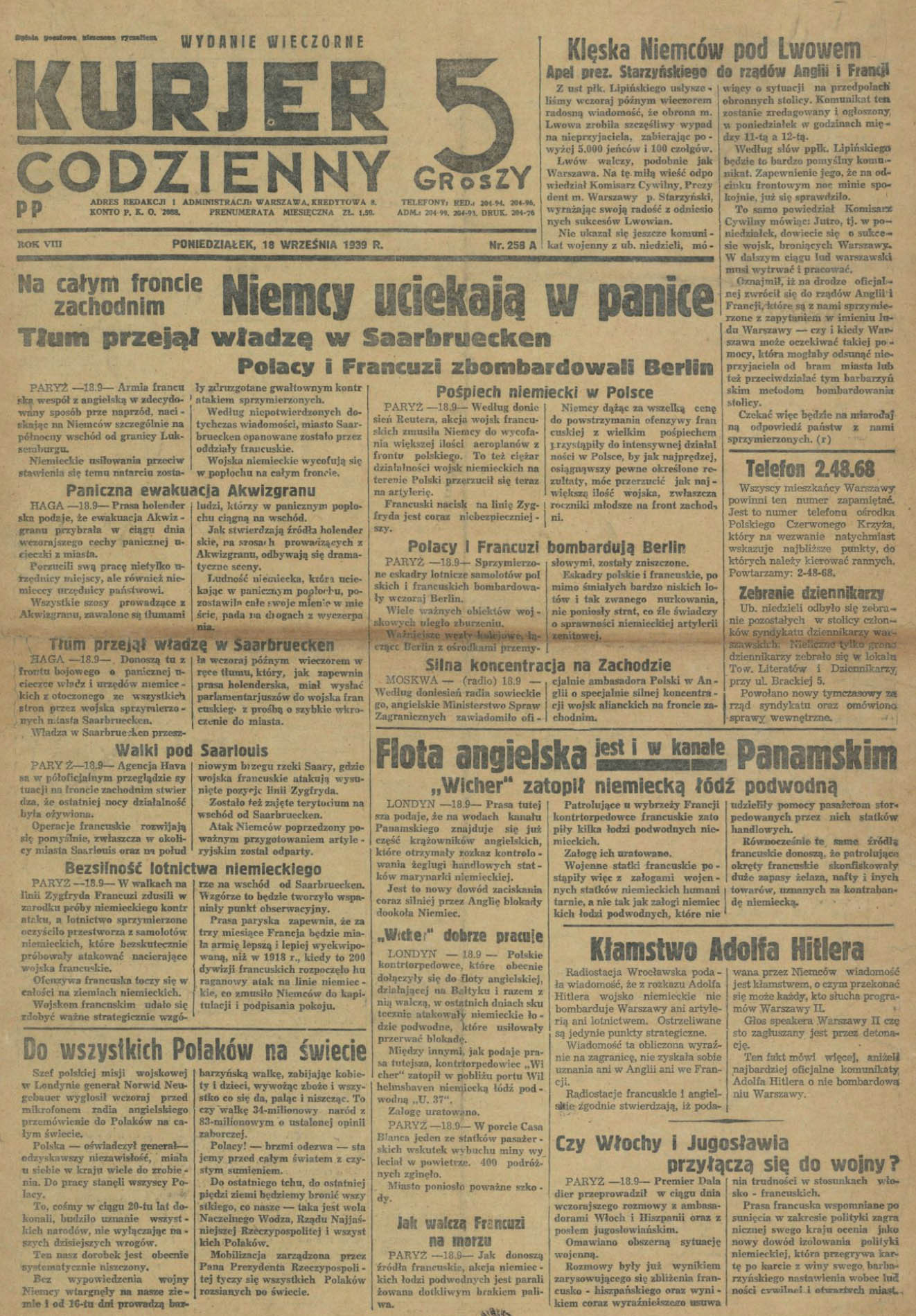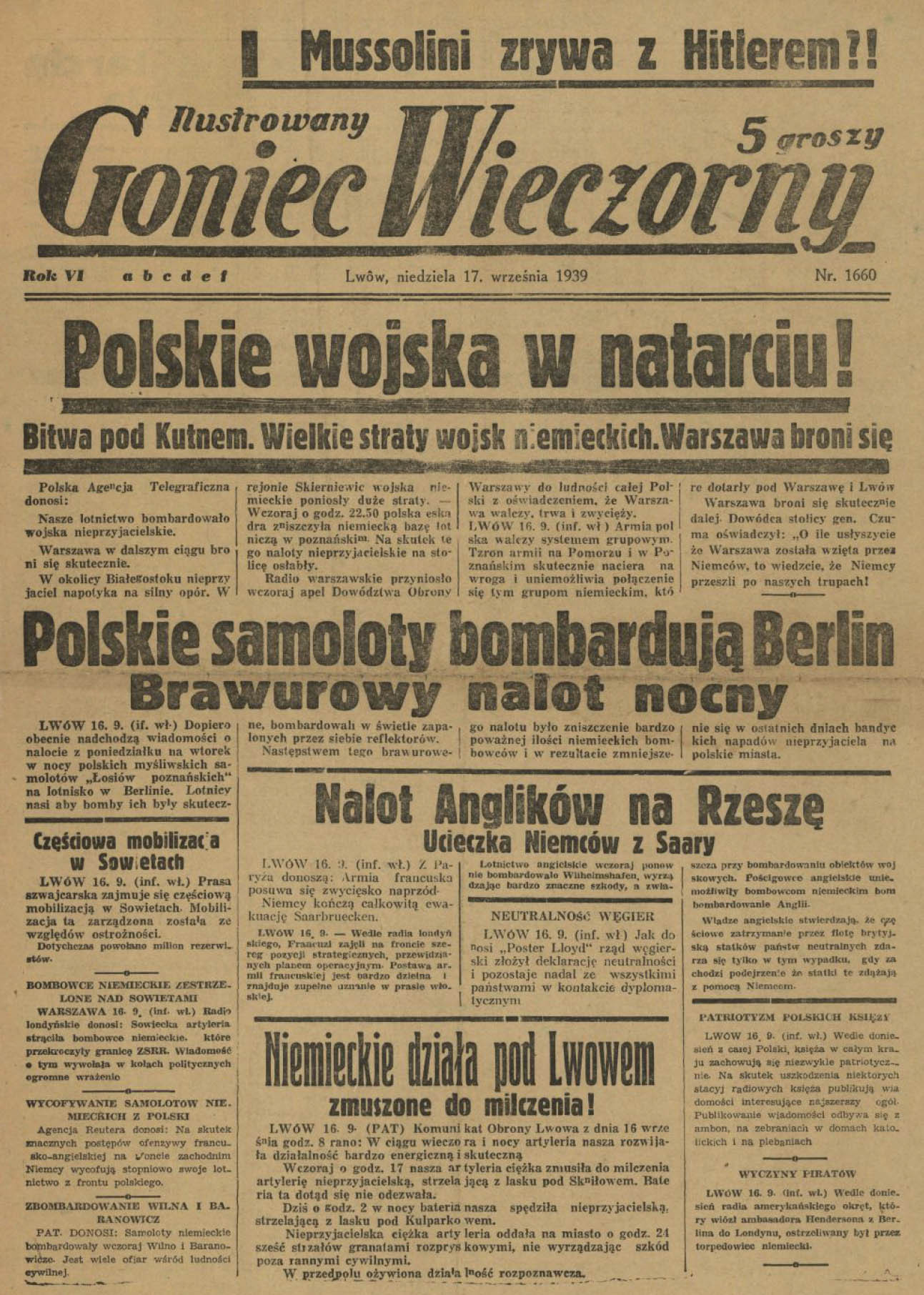 6 сентября 1939 года. Налет 30 польских бомобардировщиков на Берлин. Линия Зигфрида прорвана в 7 местах.Немецкие войска в панике разбегаются
