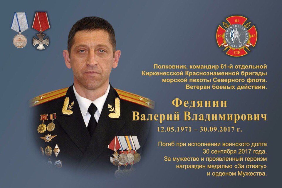 В Сирии погиб командир 61-й отдельной Киркенесской бригады морской пехоты Северного флота, полковник Валерий Федянин. По словам его сослуживцев, которые поделились печальной новостью в социальных сетях, причиной смерти комбрига стал подрыв на фугасе.