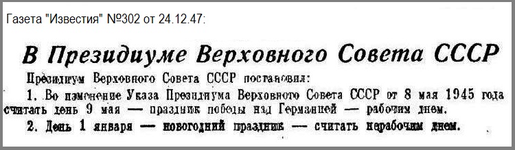 Еще один нюанс для понимания. До 1947 года 1 января был рабочим днем. Кроме того "Праздники в СССР тогда постоянно реорганизовывались. Например, 3-е сентября - День Победы над Японией и окончания 2-й Мировой Войны был выходным и стал рабочим днем в 1947-м году. Сейчас его вообще забыли. Ещё был выходной 22-го января - день смерти Ленина (памяти). Рабочим днем он стал в 1951-м году". Много чего было тогда...