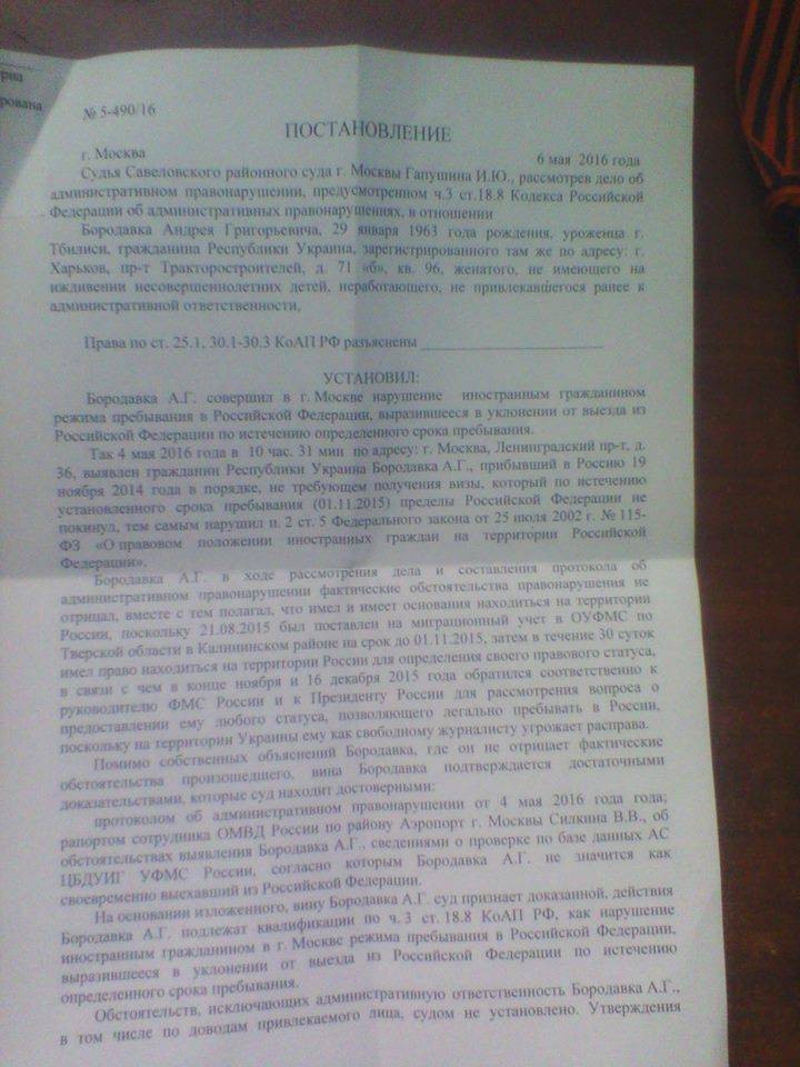 Ситуация, нешуточно всколыхнувшая интернет-пространство по обе стороны российско-украинской границы. Действительно, такое происходит не каждый день. И, так как разные стороны по-разному трактуют происходящее, для читателей я решил сделать нечто вроде экспресс-анализа, состоящего из двух частей. Первая посвящается Андрею Бородавке как виновнику шума, вторая — нашей отечественной системе правосудия.Итак, решением Свердловского районного суда города Москвы от 6 мая 2016 года украинский журналист Андрей Бородавка был признан виновным в нарушении сроков пребывания в Российской Федерации. Бородавка был приговорён к штрафу в размере 5 тысяч рублей, но, что гораздо более важно, к депортации обратно на Украину.