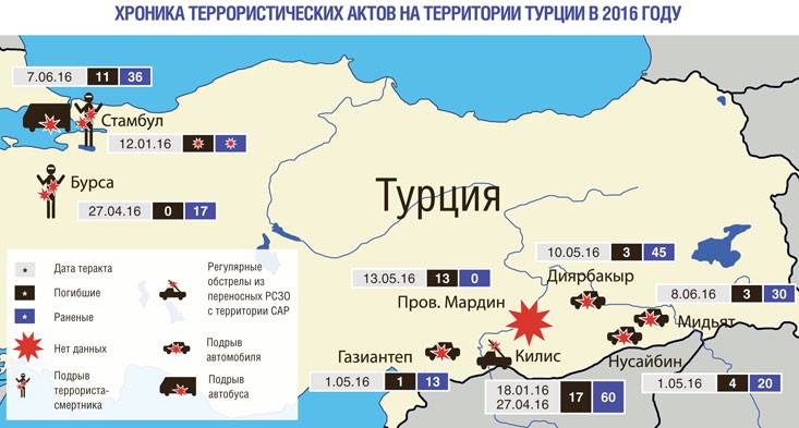 При этом масштабы террористической угрозы не ограничиваются аэропортом Стамбула – атакам за последние несколько лет помимо этого мегаполиса подвергались также провинциальные города и столица. Жертвами терактов были иностранные туристы и турки – гражданские лица и представители силовых ведомств. Статистика демонстрирует нарастание уровня потерь среди последних в 2016 году наравне с крайне высоким уровнем террористической опасности, которая властями страны явно недооценивалась (в том числе из-за их связей с такими радикальными структурами, как «Джабхат ан-Нусра», «Ахрар аш-Шам» и ИГ, борющимися за контроль над Сирией).