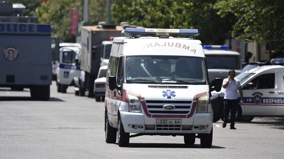 Автомобиль скорой помощи у захваченного здания отделения полиции в районе Эребуни на окраине Еревана