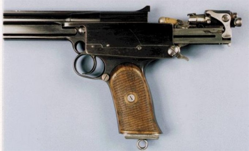 Этот пистолет был разработан в 1900 году английским конструктором Хью Габбетом-Фейрфаксом. Один из первых самозарядных пистолетов получился невероятно сложным как в производстве, так и в эксплуатации. Патрон из магазина извлекался назад, после чего досылался в патронник, а отработанные гильзы летели прямо в лицо стрелку.