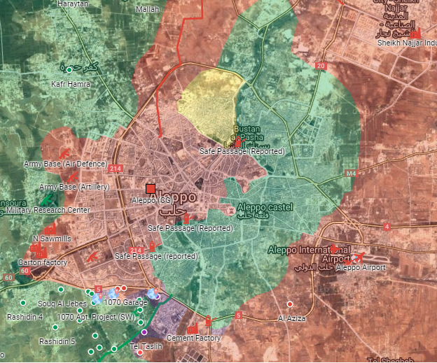 Еще в июле «красными» силами Асада был захлопнут котёл вокруг восточных кварталов Алеппо, и им на выручку были брошены все наличные резервы «зеленых» - «оппозиции». В последних числах июля и в первых числах августа они, не считаясь с потерями, прогрызали коридор к осажденной группировке. В конечном итоге физический контакт между группировками был установлен, что, правда, не сильно помогло осажденным, так как линии коммуникаций группировки оставались под постоянным огнем «красных».