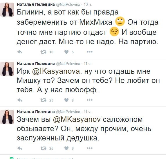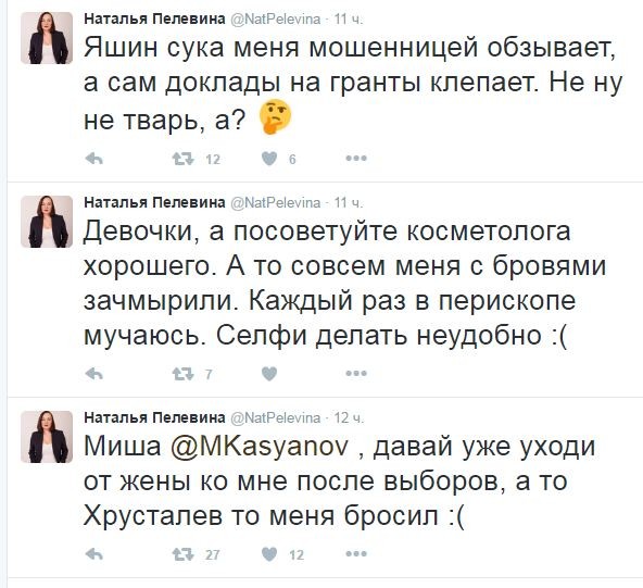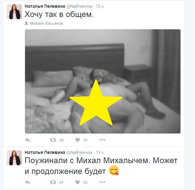 Сейчас на твиттер-аккаунте Натальи происходит самая настоящая вакханалия, после которой мне бы просто стало стыдно появляться на людях. На протяжении суток в профиле публикуют порочащие сообщения, которые касаются ее «кроватного» друга Михаила Касьянова, его жены, а также оппозиционера Яшина.