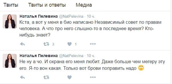 Во-вторых, то, что происходит в твиттере Натальи - не удивительно. Люди понимают, кем является оппозиция, а в нашем случае продажная Пелевина, именно поэтому публикуют подобные сообщения.