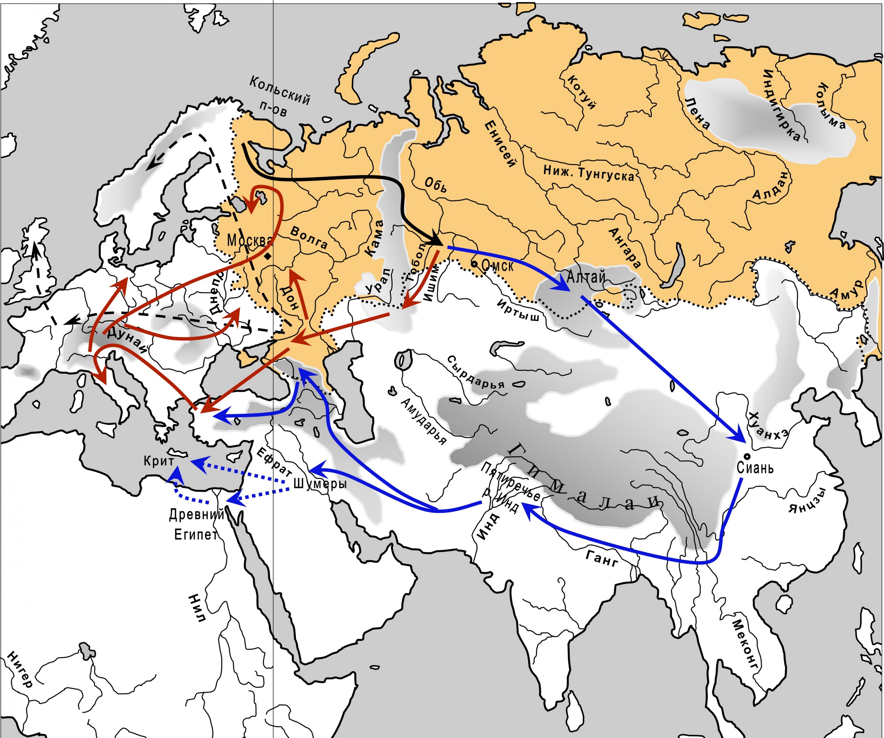 Одни арии уходят на восток в сторону Алтая - азиатский магистральный путь переселения. Другие - на юго-запад в южно-уральские степи (европейский магистральный путь)
