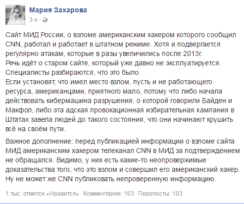 Как вы понимаете, обвинения в очередной раз основываются на железном «мы уверены», а доказательств нет от слова вовсе. Но ничего, мы уже привыкли. Так вот, американский хакер (притом довольно известный и уважаемый среди тамошних спецслужб) сообщил CNN, что нашел брешь в компьютерном коде вебсайта МИД РФ и добавил в нее собственный код. Он решил «сделать предупреждение», как сам утверждает, поэтому оставил послание: «Товарищи! Мы прерываем программу вещания сайта российского МИД, чтобы передать вам следующее важное сообщение — прекратите. Возможно, у вас получается запугивать соседние страны, но это Америка. Здесь это никого не впечатлило».