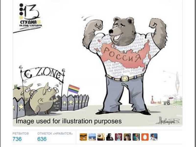 Для этого посольство опубликовало карикатуру сотрудника государственного информационного холдинга МИА «Россия сегодня» Виталия Подвицкого (конкретное изображение было выполнено им в рамках работы в своей «Студии 13»). На ней Россия, как и обычно в его работах, представлена в образе медведя, тогда как «оппоненты» страны из Евросоюза нарисованы как свиньи. Автор также сопроводил их загон-еврозону изображением флага ЛГБТ.