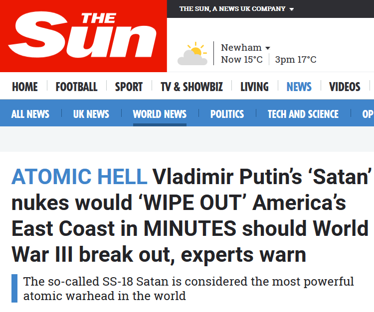 "...путинская "Сатана" сотрет с лица Земли все восточное побережье Америки за несколько минут, если когда - нибудь начнется Третья мировая война!", - срываясь на фальцет кричит издание The Sun.