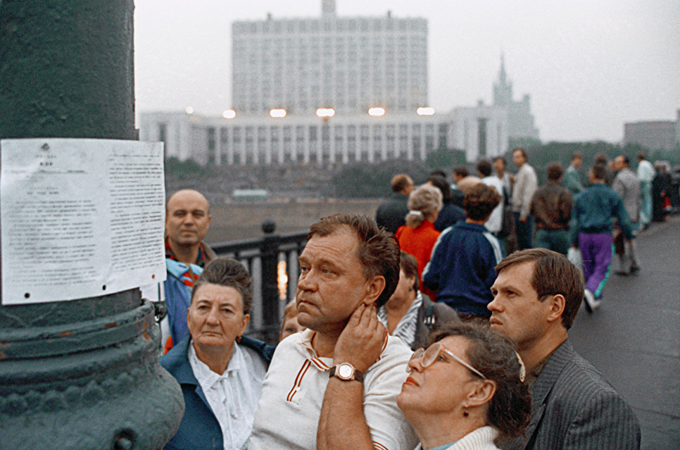 Встревоженные москвичи читают воззвание ГКЧП, расклеенное на улицах города 19 августа 1991 года