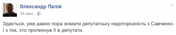 «Кажется, уже давно пора снимать депутатскую неприкосновенность с Савченко. И с тех, кто пропихнул ее в депутаты», - выразил мнение политолог Александр Палий.