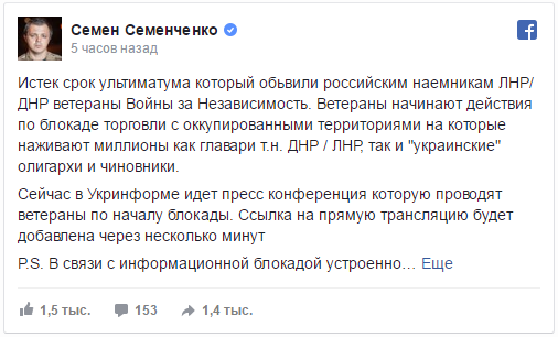 "Истек срок ультиматума который объявили ЛНР/ДНР ветераны "войны за независимость". Ветераны начинают действия по блокаде торговли с территориями, на которых наживают миллионы: как главари ДНР/ЛНР, так и украинские олигархи и чиновники", - написал сегодня у себя в Facebook бывший комбат батальона "Донбасс", депутат Рады Семен Семенченко.