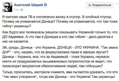 Пойми, Толь, твое сраное мнение, вообще никого не волнует. Ну может какое-то незначительное количество идиотов на Украине, считающих себя "нормальными украинцами" и ждущих, когда же Майдан падет. Но не более того. Поэтому еще раз: твоя задача - не мнением своим делиться, а снимать смешные видео про Украину и украинцев. Мы, русские, их смотрим и хохочем. Тебе за просмотры капает денежка от рекламы на Ютубе. На эту денежку ты можешь себе и своей бабе купить брендовые шмотки и вообще красиво жить в Европе. Вот и не ломай эту схему. Мы - русские. Донецк - русский город. А ты - украинец, что приносит нам веселье.