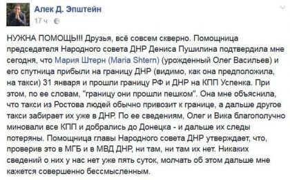 Итак, речь идет об гражданах Российской Федерации, отправившихся в ДНР с «пацифистской» миссией от ЛГБТ-движения: 30-летнее Серое Фиолетовое (говорит о себе в среднем роде) оно же Мария Штерн (Maria Shtern), а по паспорту Олег Васильев (на фото сверху) и его спутница 27-летняя «активистка» Виктории Мирошниченко. Первым забил тревогу на своей странице в Facebook израильский «культуролог» Алек Эпштейн, его поддержали другие «побратимы» и крики вселенского масштаба окутали планету.