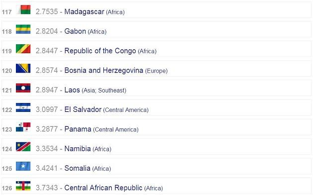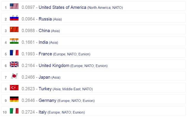 Первое место в общем рейтинге заняли США, за ними следуют Россия, Китай, Индия, Франция, Великобритания, Япония, Турция, Германия и Италия. Армии Мадагаскара, Габона, Демократической республики Конго, а также Боснии и Герцеговины оказались самыми слабыми в мире.