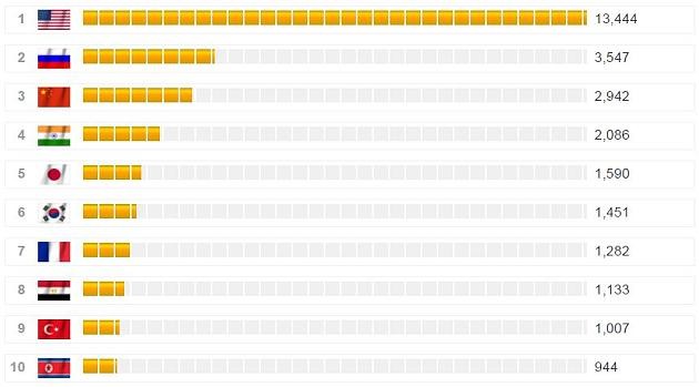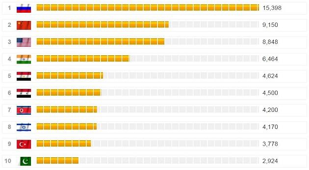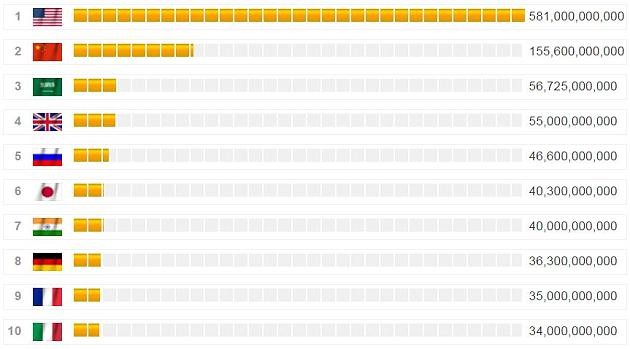 Неудивительно, что за счёт только одного количества солдат (2,3 млн) Китай занял третье место в списке, рассуждает журналист. Хотя и объём имеющегося у страны вооружения впечатляет: 9150 танков и более 700 кораблей. У России же 15 398 танков, что делает её безоговорочным лидером по этому показателю, а её сухопутную армию — сильнейшей. Обогнать Россию по военному потенциалу смогли только США с 8848 танками, 13 444 самолётами и вертолётами, а также военным бюджетом $581 млрд. По части расходов на оборону американцы опережают своего ближайшего оппонента Китай на $400 млрд, подчёркивает автор.