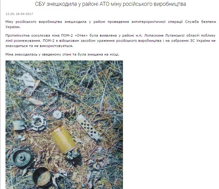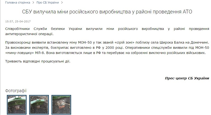 Пару дней назад украинское так называемое «СБУ» опубликовало пару публикаций, в которых уверяло что нашло на Донбассе (на временно оккупированной украиной территории ДНР мины российского производства. Именно российского, что отдельно отмечалось. Две якобы были найдены неподалеку н.п. Широкая Балка (ДНР), это МОН-50 и МЛ-8, и одна – ПОМ-2 была найдена в ЛНР. Текстовые вбросы были подкреплены мутными фотографиями, на этот раз, на удивление у кого-то нашелся допотопный телефон с камерой в 1.3МР, судя по качеству фоток, но вот всяких линеечек, бумажечек с фиксацией даты, и прочих атрибутов, фигурирующих на фотофиксации подобных находок, под рукой конечно же не оказалось. Наверное это должно намекать на случайность находки, но пока что это намекает на срочность задачи и откровенный дебилизм её исполнителей. Конечно, это ведь не жителей Авдеевки убивать, а «российские мины» обнаруживать…