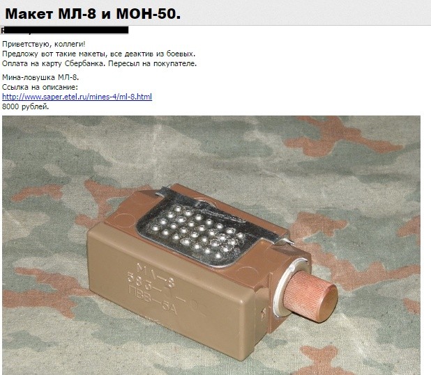 Хотя… А мог бы я например, купить себе таких мин для собственного пользования. Ну, макеты меня даже больше устроят. Ну не ёб**тый же я в самом деле, держать под подушкой мину-ловушку. Забиваю в гугл запрос, и – бдыдышшьь! Можно купить искомые мины в виде макетов, деактивированные, учебные и т.д. Форумы страйкболистов и любителей МГМок - наше всьё =) В случае с МЛ-8 правда, чена какая-то неадекватная, но я думаю, в стратегически важной для украины задаче составления вбросов, дискредитирующих Россию, цена в 8 тыс. рублей это вообще ни очем. Тем более, что макет такой мины можно использовать многократно, «находить российские мины» хоть каждый день.