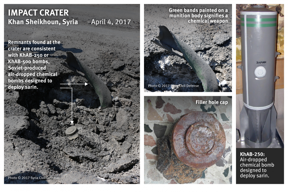 В 48-страничном отчете приводятся предоставленные очевидцами фотографии места падения боеприпаса и его осколков, а также музейный снимок советской авиационной бомбы, наполняемой зарином. Правозащитники указывают на ряд сходство с бомбой ХБ-250 или ее более тяжелой модификацией ХБ-500, в том числе на крышку отверстия для заполнения отравляющим веществом, а также характерные зеленые полосы в верхней части боеприпаса, которые едва различимы на снимке с места инцидента.