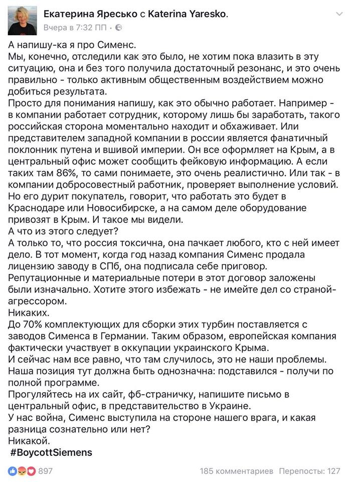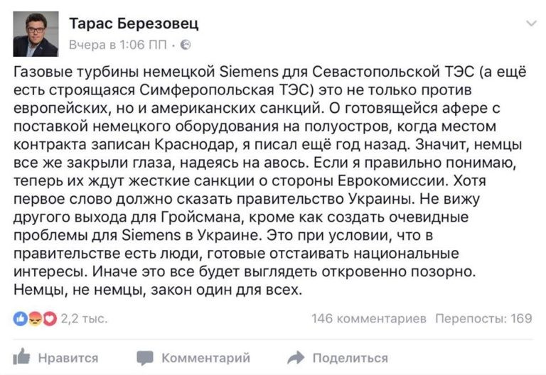 Единственное, что любопытно — кто победит в схватке The Ukraine VS Siemens. Юристы, с которыми ранее говорил Рейтер, считают, что нет судебных прецедентов, позволяющих установить, может ли Siemens быть привлечен к ответственности за нарушения режима санкций, если его турбины направит в Крым третья сторона. Впрочем, у меня есть на сей счёт некоторые подозрения, но пока воздержусь. Сохраню интригу.