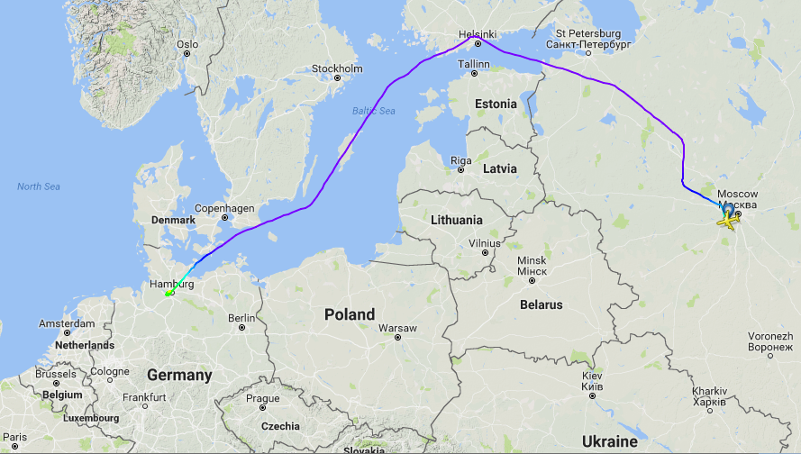 Очевидно, что для борта Путина кратчайшим расстоянием между Москвой и Гамбургом оказалась не прямая, а хитрая траектория.