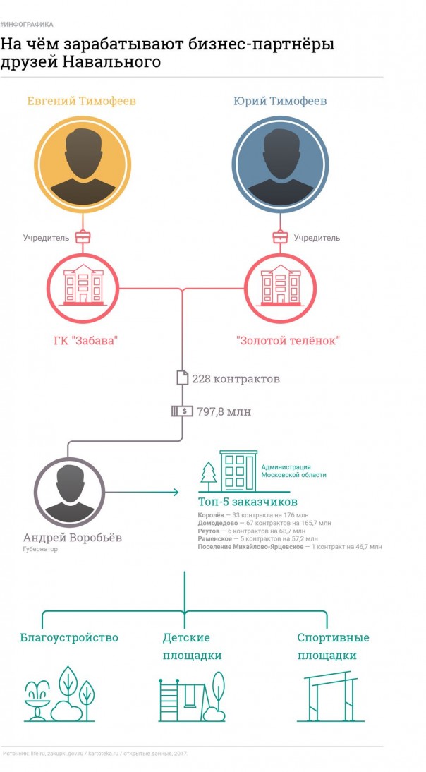 Бизнес-партнёры известного оппозиционера Алексея Навального продолжают кормиться из бюджетного котла. Как выяснил Лайф, десятки муниципалитетов и государственные структуры Московской области очень полюбили компании "Забава" и "Золотой телёнок", которые принадлежат отцу и сыну Евгению и Юрию Тимофеевым. Их фирмы выигрывают госконтракты на поставку оборудования и обустройство детских, спортивных и развлекательных площадок, заработав на этом за последние несколько лет около 800 млн рублей. У семьи Тимофеевых есть ещё один бизнес по продаже ламп — он непосредственно связан с Фондом борьбы с коррупцией (ФБК) Алексея Навального и его проектом "Роспил".