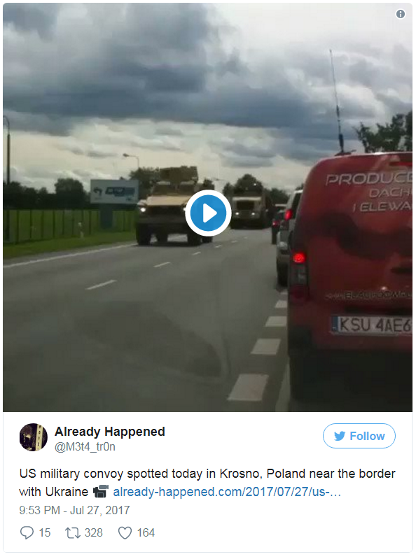 Военный конвой США замечен вчера в Кросно, Польша недалеко от границы с Украиной, двигающийся в сторону границы: