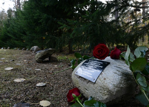 Цветы в память о жертвах нацистского режима в лагере смерти Собибор в Польше
