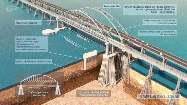 После того, как часть свидомых таки поверила, что мост это реальность, а не декорации на Мосфильме, укроплач принял другое направление, теперь они стенают, что высота пролетов моста, а это 35 метров, якобы ограничит проход крупнотоннажных судов в порты Мариуполь и Бердянск.