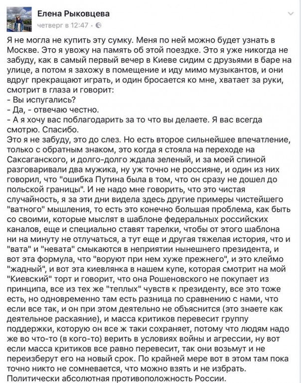 Я теперь буду везде высматривать эту сумку. Нет, не для того, чтоб «отобрать», как опасаются некоторые комментаторы. Я просто хочу поговорить. И посмотреть в «честные» глаза журналистки Радио Свобода, которая так любит Украину и так не любит страну, гражданкой которой является.