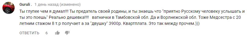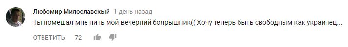 Дальше он рассказывает о том, что у украинцев есть национальный дух, что они если что - на Майдан. А русские бесхребетные рабы, которые покупают себе квартирки, машинки, живут сыто, и ничего изменить не могут. Конечно, это видео наполнено сарказмом, и человек, который видит ситуацию с обеих сторон решил пошутить, конкретно так. В окмментариях, естественно, нашлись как те, кто не понимает таких шуток, так и те, кто от души посмеялся. Особенно комментаторы отмечают актерскую игру автора видео. Многие продолжают шутить на заданную тему:
