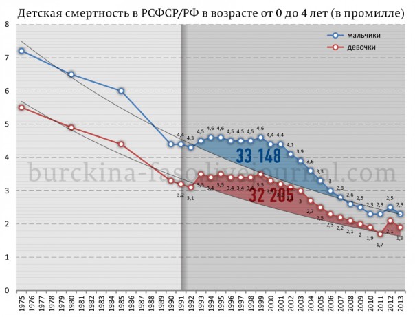 Но все дело в том, что повышенная смертность в 90-е была не только среди взрослых, но и среди детей: от младенцев до 15 летних подростков включительно. Интересно, а эти дети тоже умерли по причине своего алкоголизма, наркомании и лени? А может эти дети не умерли? Нет, умерли. Это хорошо видно на графиках, составленных мною по официальным данным Росстата. Вот полюбуйтесь на кривую смертности мальчиков и девочек в возрасте от 0 до 4 лет включительно.