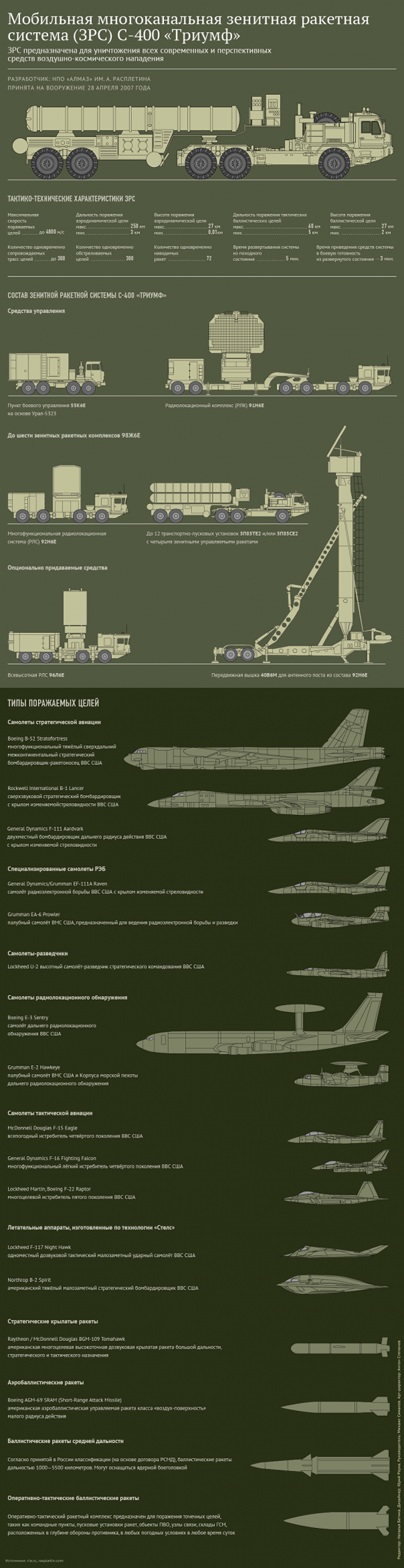 Перехват самолетов и боевых блоков МБР на высотах до 27 километров, моментальное развертывание и около сотни одновременно наводимых зенитных ракет — уникальная система С-400 "Триумф" уничтожит баллистические цели на учениях "Запад-2017". Подписанный с состоящей в НАТО Турцией контракт на поставку "Триумфов" вызвал ажиотаж в российских и западных СМИ. По мнению журнала The National Interest, эта сделка подарит альянсу самые современные российские технологии в сфере ПВО и позволит выработать для них эффективное "противоядие". Впрочем, не все так просто. О том, что говорят о системе С-400 на Западе и почему ее главные секреты не покинут пределов России, — в материале РИА Новости.