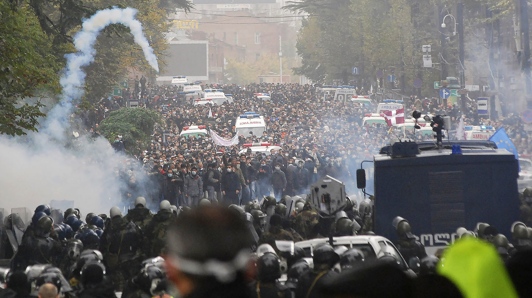 Столкновение полиции с оппозиционными сторонниками во время митинга перед зданием парламента в Тбилиси 7 ноября 2007 года
