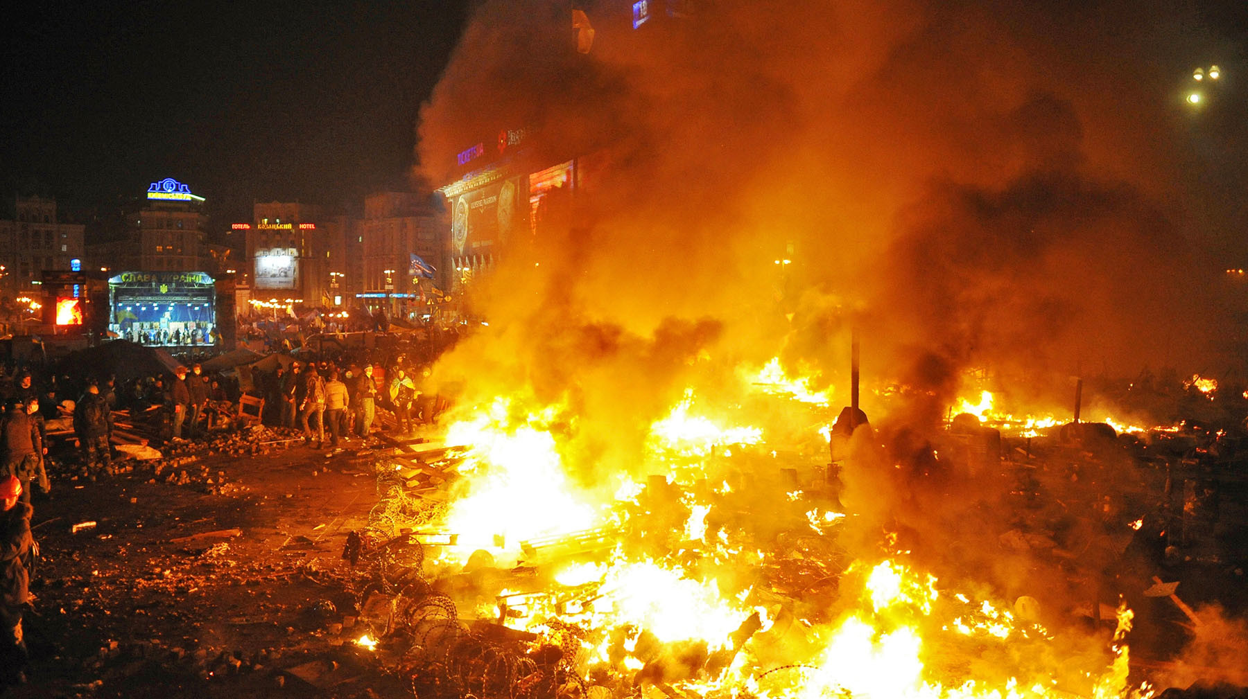 Горящие костры и палатки на площади Независимости в Киеве, где начались столкновения оппозиции и сотрудников милиции