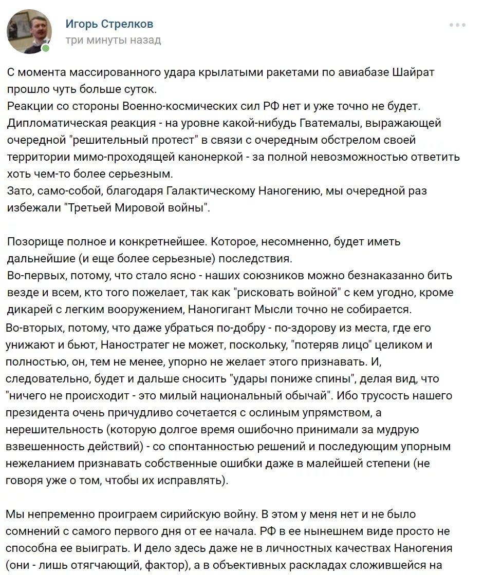 В своем посте в «Контакте» Стрелков изобразил российских добровольцев в качестве «пушечного мяса», которым прикрывают подходы сирийцам и выручают из переделок военную полицию. При этом беглый командир не преминул сопоставить свою фигуру с высшим военным командованием, выставив себя в качестве народного радетеля. Мол, «шифровок со сводками не получаю», но информацию о погибших рассекречиваю, саркастически подытоживает свой паникерский спич Гиркин.