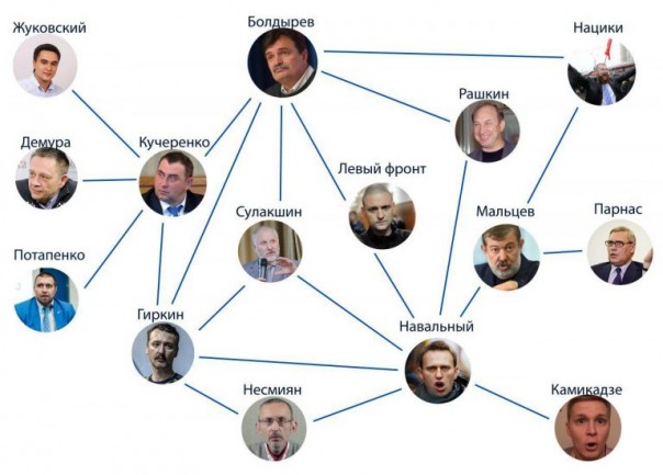Дальше я уже просто отслеживал ниточки. Болдырев плотно сотрудничает с небезызвестным Игорем Всеволодовичем Гиркиным, «Партией Дела» и «Левым Фронтом». В тусовку Гиркина вхож Максим Калашников (Кучеренко) из той же «Партии Дела». Гиркин устраивал клоунские дебаты с Навальным (зачем?). «Левый Фронт» вместе с Навальным скакал на Болотной в 2012 году (за что Удальцов сел, а Навальный нет). На Болотной скакал также Анатолий Несмиян (Эль-Дурид), ближайший соратник Гиркина. Чуть не забыл про такого интересного персонажа, как ельциноид Сулакшин, который в 2012 году работал на Навального, а потом обслуживал Гиркина. Видите, какой клубок вырисовывается? А это только первый слой!