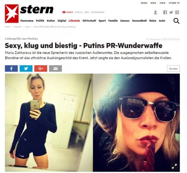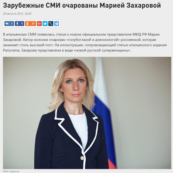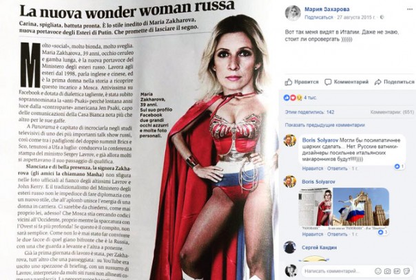 В итальянской прессе после назначения Захаровой на пост официального представителя МИД РФ появилась статья о «новой русской суперженщине». Захарова сама рассказала на своей странице в социальной сети Facebook о публикации итальянского журнала Panorama. Представитель внешеполитического ведомства был удивлена образом, который выбрали для нее итальянцы.