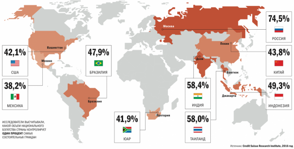 Особенно сильно уровень неравенства (как доходов, так и состояний) вырос за последние 30 лет, и это касается практически всех стран мира. Так, верхние 10% общества присваивают себе 37% национального богатства в Европе и 41% — в Китае, 46% в России. В Бразилии и на Ближнем Востоке этот показатель соответственно составляет 55% и 61%. Чрезвычайно быстрыми темпами выросло после распада СССР имущественное расслоение в России, где показатель неравенства даже превосходит китайский. Но особенно очевиден рост имущественного неравенства в США, где 1% общества имеет около 40% национального богатства, в то время как в 1980 году этот показатель не превышал 22%.