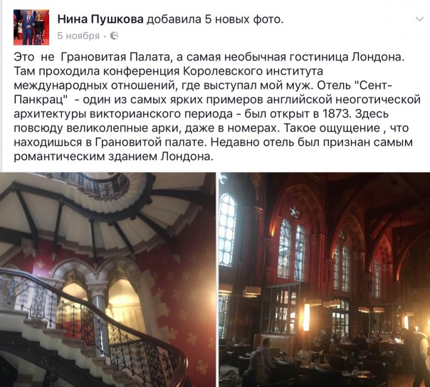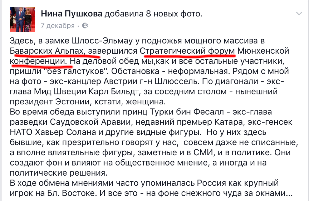 Думаю, автор остался доволен и полученный гонорар оказался честно заработанным. Вот только есть один нюанс. Я тоже заглянула на страницу жены Пушкова. И всё,что я там нашла - это её впечатления от стран, которые она посетила в рамках служебных командировок мужа. Напомню, что Пушков - не рядовой сенатор. Он - глава комиссии Совета Федерации по информационной политике и до недавнего времени занимал пост председателя комитета ГД по международным делам. Надеюсь, вы понимаете, что человек подобного уровня - довольно частый гость на различного рода международных мероприятиях. Причём, посещает он их не в частном порядке, а как официальное лицо, представляющее Россию. Кстати, Нина Пушкова сопровождает супруга в загранкомандировках за счёт собственных средств.
